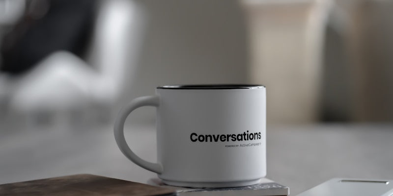 white conversations printed mug near smartphone